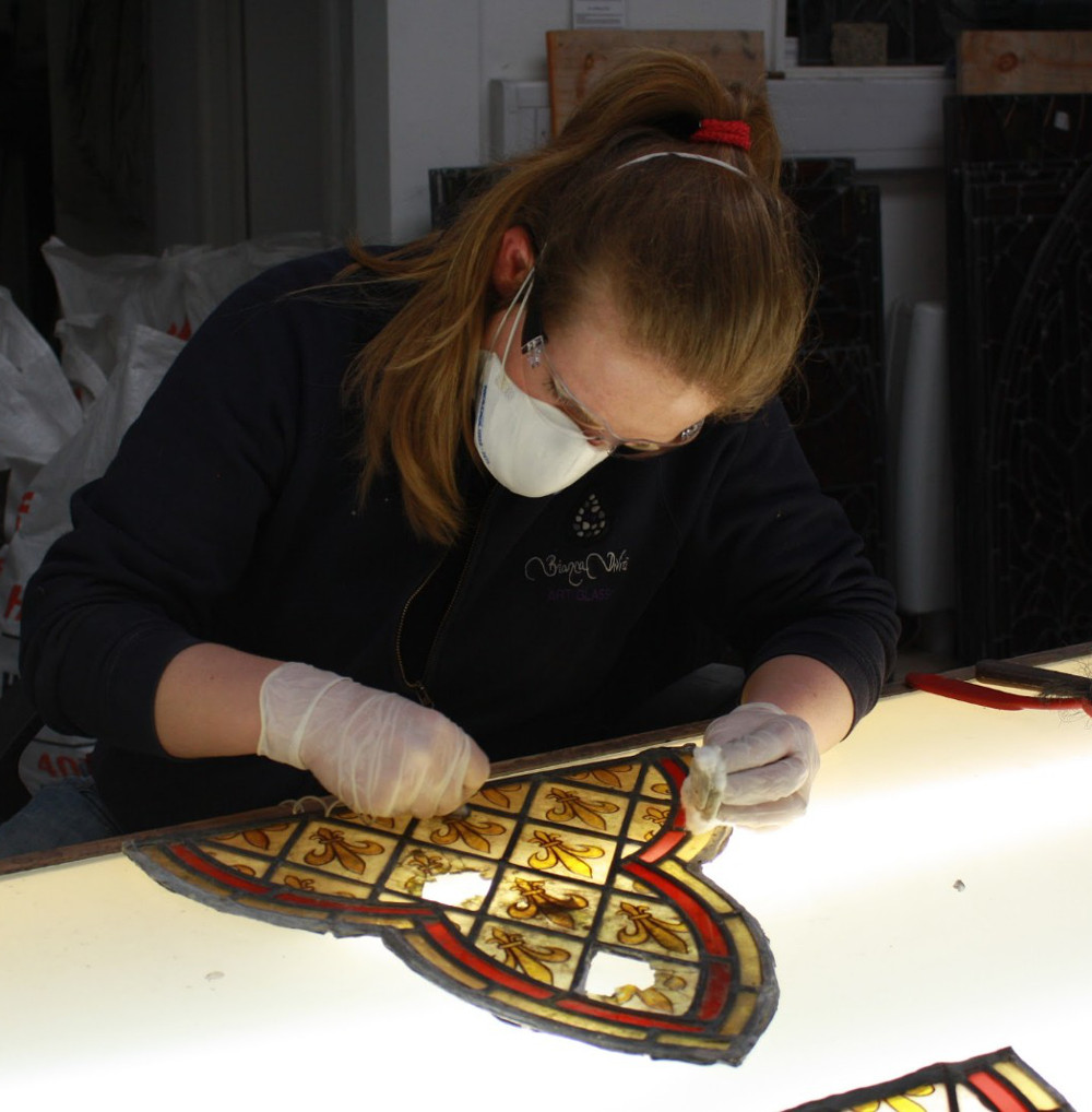 Her training and work extends to many top studios in the U.K including Canterbury Cathedral and Holy Well Glass in Somerset, where she trained and worked in traditional conservation techniques to safeguard the cultural heritage embedded in stained glass masterpieces.